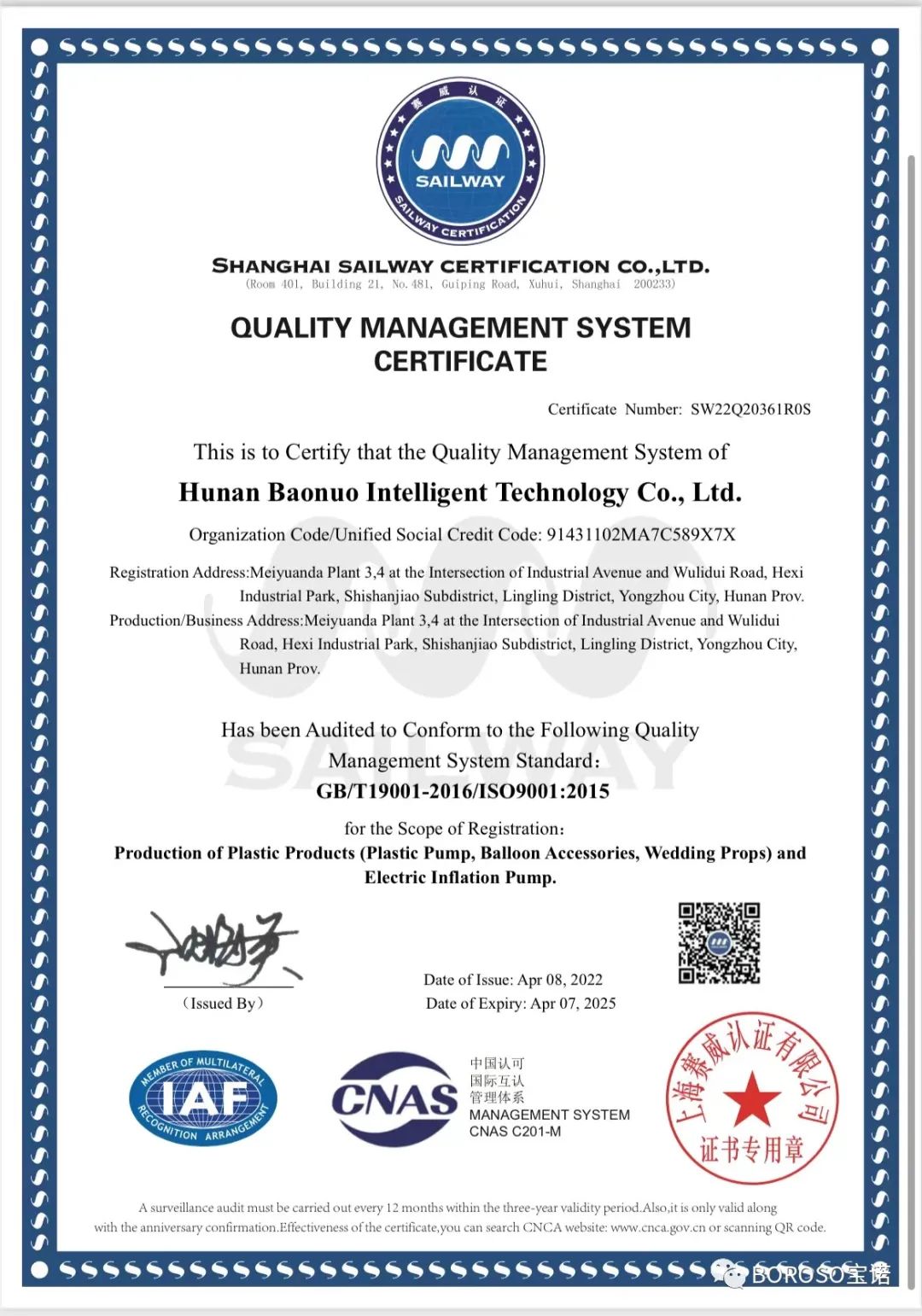 BOROSO hunan production base recently passed the ISO9001 international quality management system certification. Through the certification, its can help enterprises improve quality management ability, strengthen quality management, improve the level of internal management of enterprises, improve the quality ability of all personnel of enterprises, reduce the impression caused by the resignation of employees. Enhance customers' confidence in Bonoit, expand market share and improve corporate image.